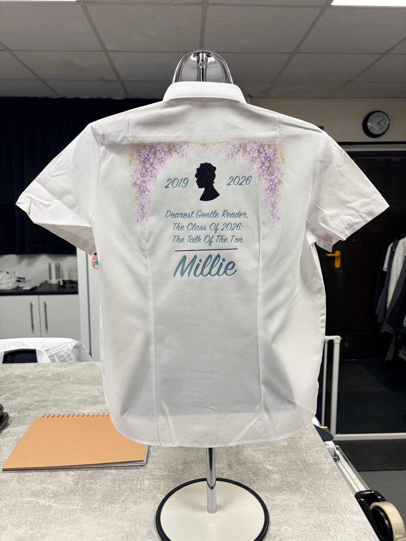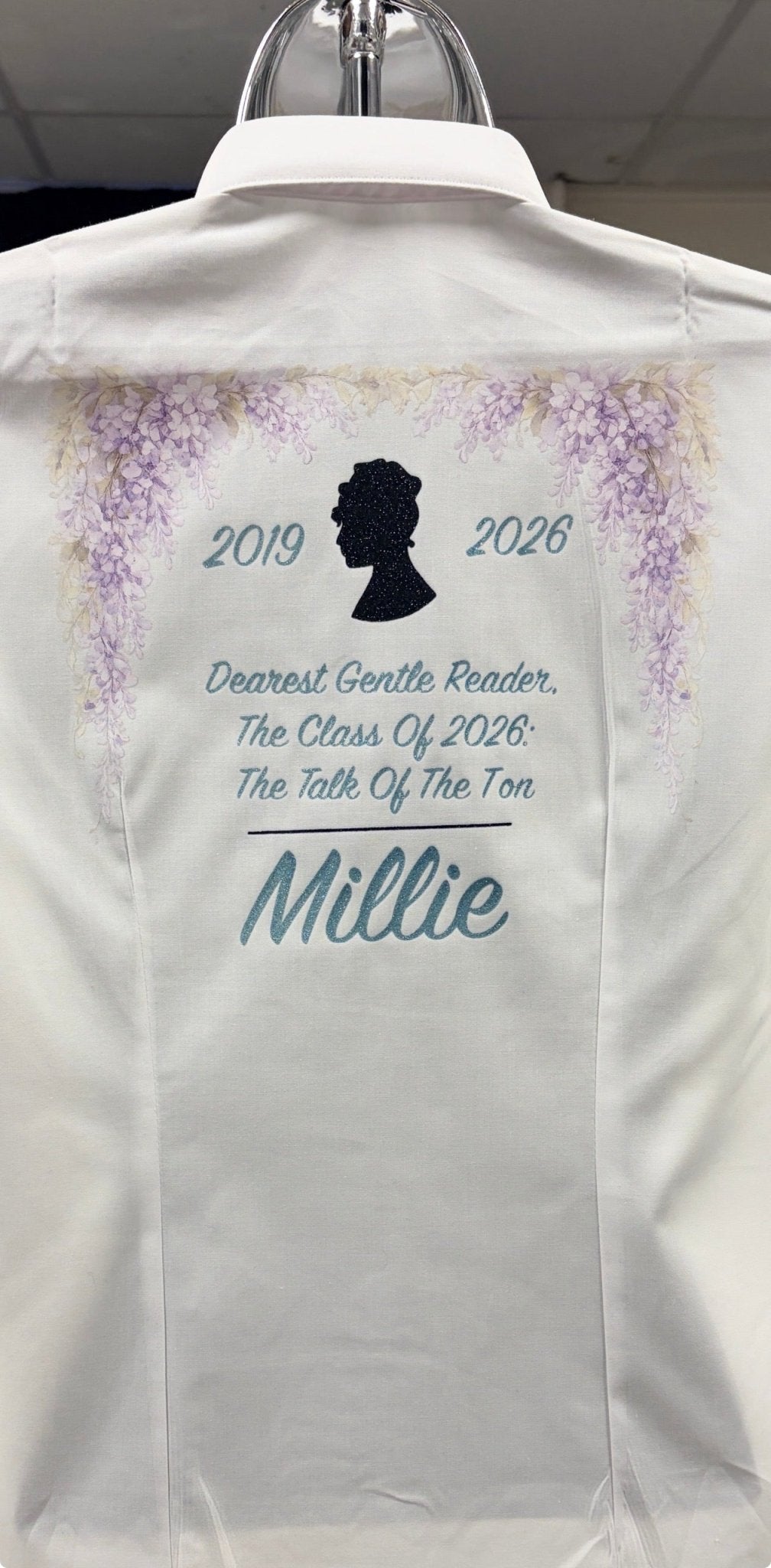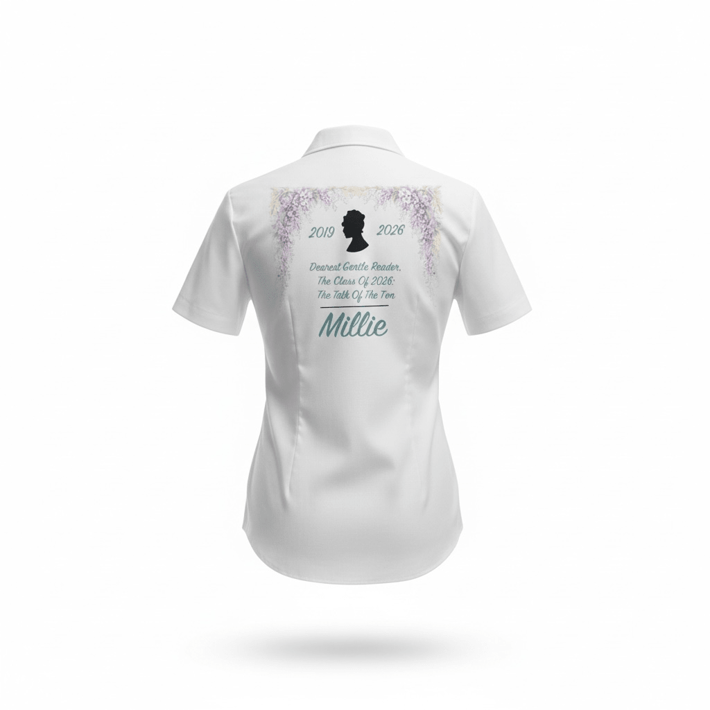 Adorned with cascading lilac florals, a glitter silhouette cameo, and the phrase “Dearest Gentle Reader, The Class of 2026: The Talk of The Ton,” this shirt is sure to turn heads at your leavers’ assembly or final school photo. Each shirt is personalised with the pupil’s name and years attended, creating a one-of-a-kind keepsake worthy of Lady Whistledown herself.