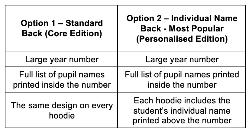 The back of the hoodie is where the main leavers’ design sits and is usually the most eye-catching feature.